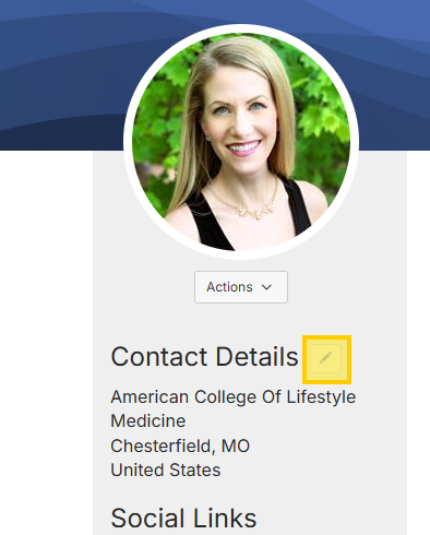 Once on your profile page, please select the pencil icon next to "Contact Details" in the left column under your photo: