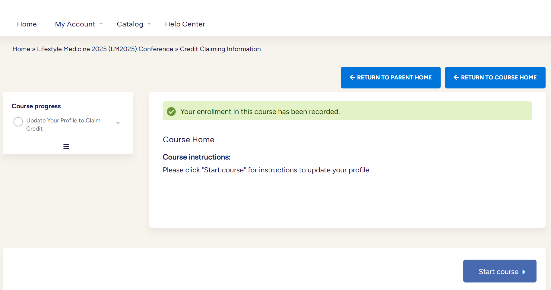 Click on Start course and continue following the steps to claim credit and generate your certificate: